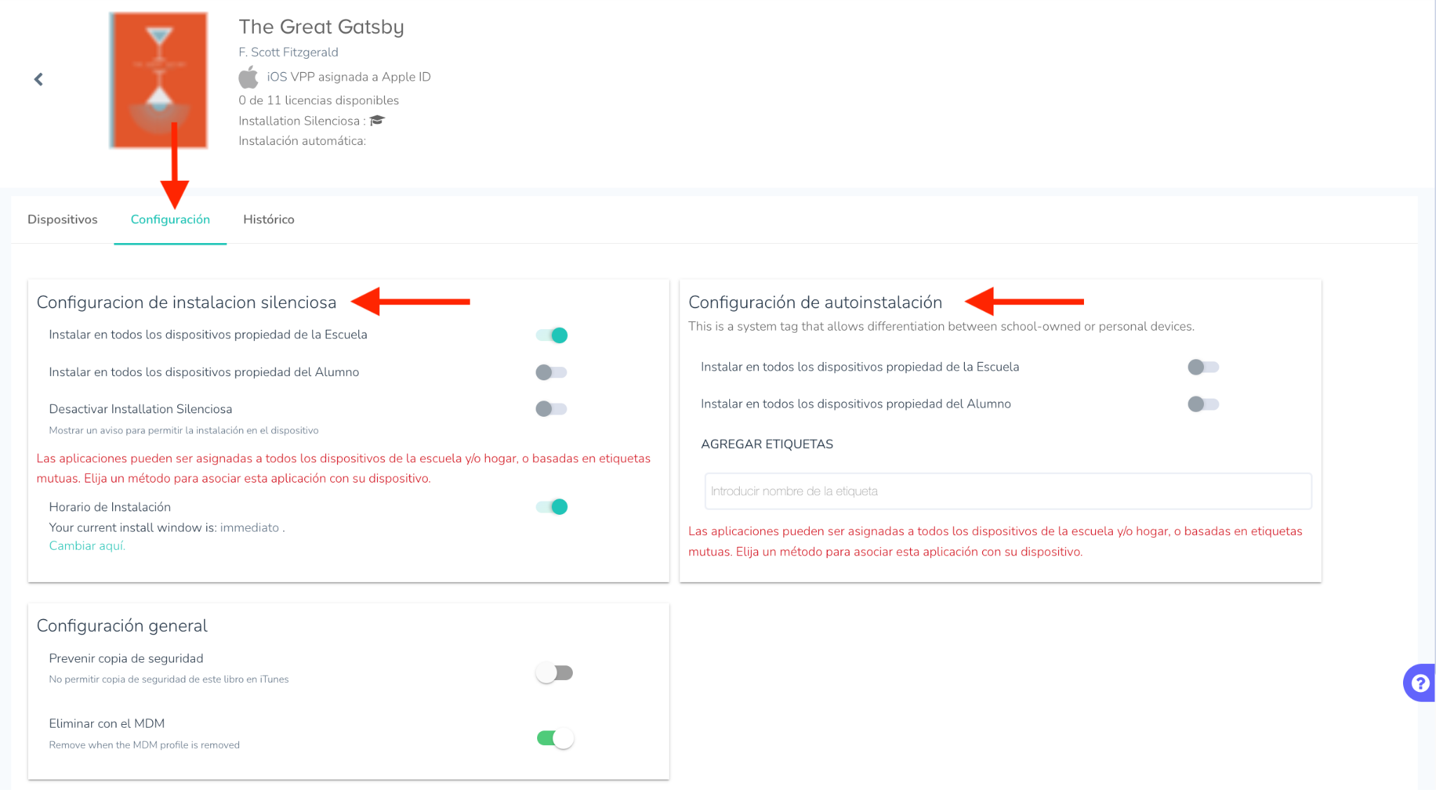 - Pestaña de Ajustes: Seleccione la pestaña "Configuración" para navegar a la sección donde aplicaremos las etiquetas. En la ventana de ajustes, tendrá la opción de asignar a dispositivos de propiedad particular o propiedad de la escuela, o utilizar etiquetas (Tags) para la "Instalación automática" o "Autoinstalación".