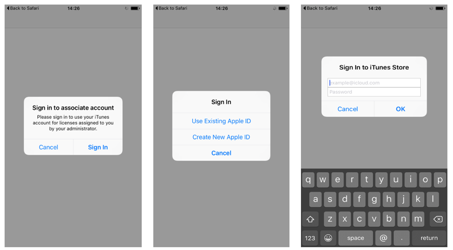 - Invitación VPP: Si se realiza con éxito, se mostrará la invitación VPP, lo que permitirá al usuario iniciar sesión con su Apple ID. Es importante NO utilizar el mismo Apple ID que se usó para configurar su cuenta VPP.