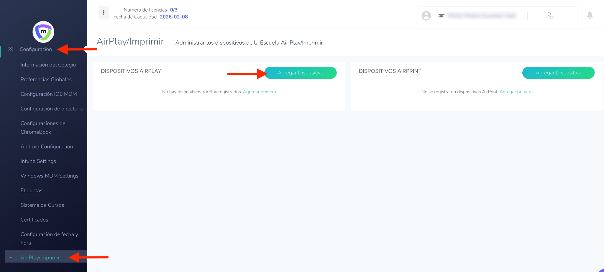 Siga los pasos a continuación para agregar dispositivos AirPlay y AirPrint a su Panel Escolar de Mobile Guardian.