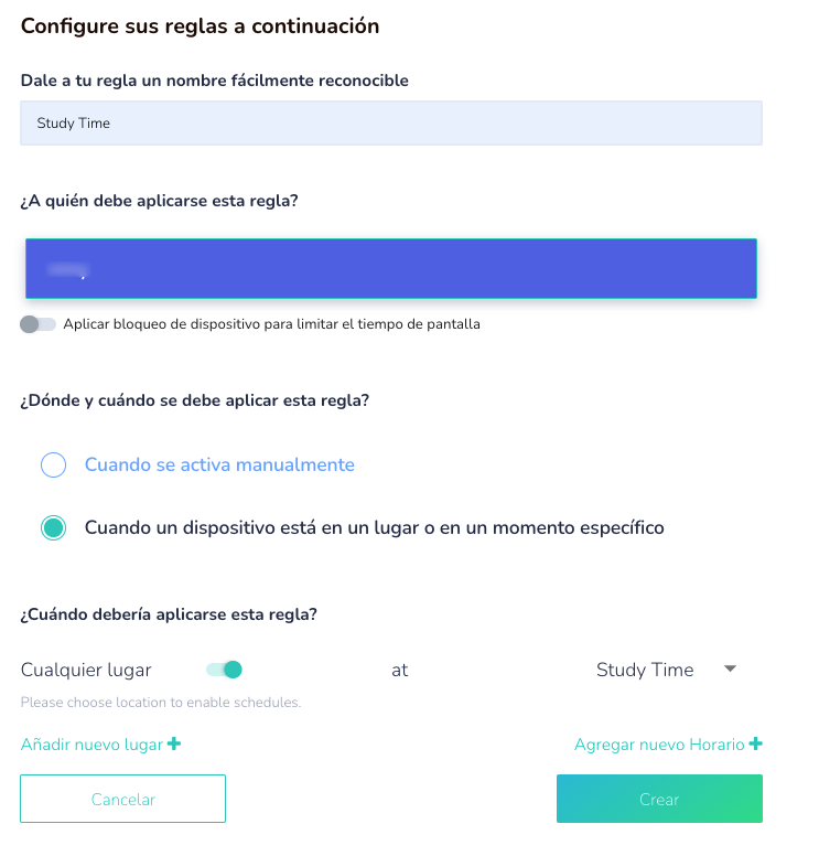 - Para aplicar una regla en un lugar o momento específico, seleccione esta opción y configure su Lugar y Horario.