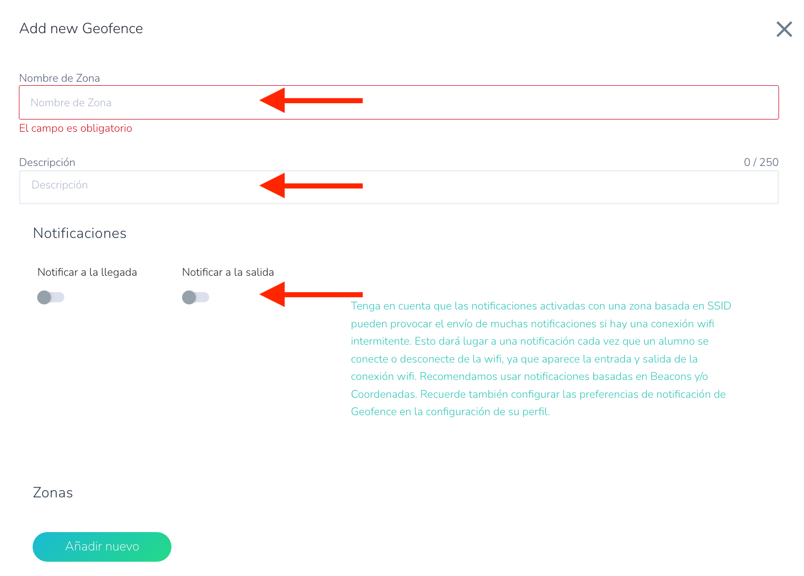 - Introduzca un nombre de la zona (obligatorio) como Casa, Escuela, Práctica de fútbol, etc.
