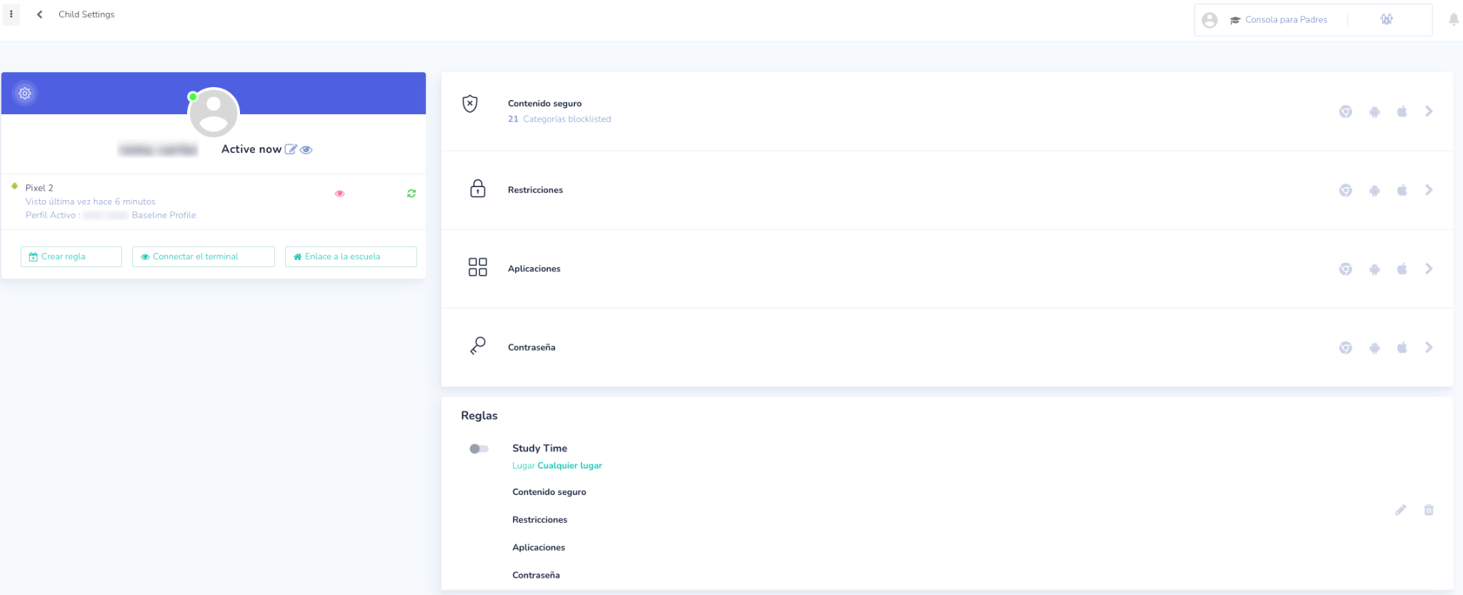 Mobile Guardian utiliza reglas para ayudarle a usted, como padre, a gestionar de manera eficaz el tiempo que su hijo pasa en su dispositivo móvil. La sección de Reglas le permite gestionar lo siguiente: