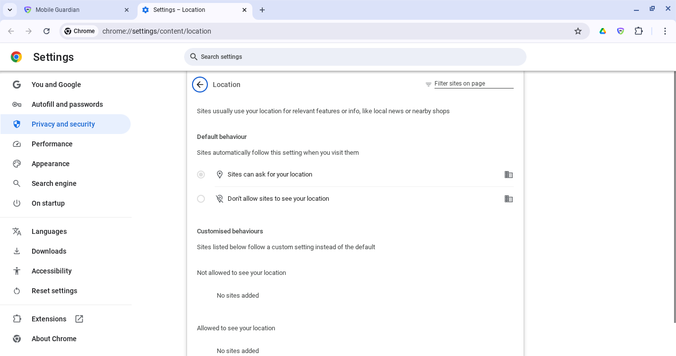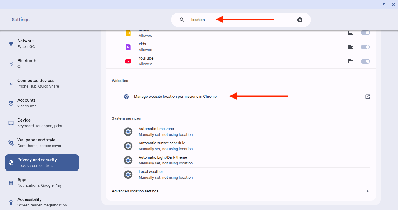 - Abra Chrome y vaya a Settings (Configuración) > Content (Contenido) > Location (Ubicación).