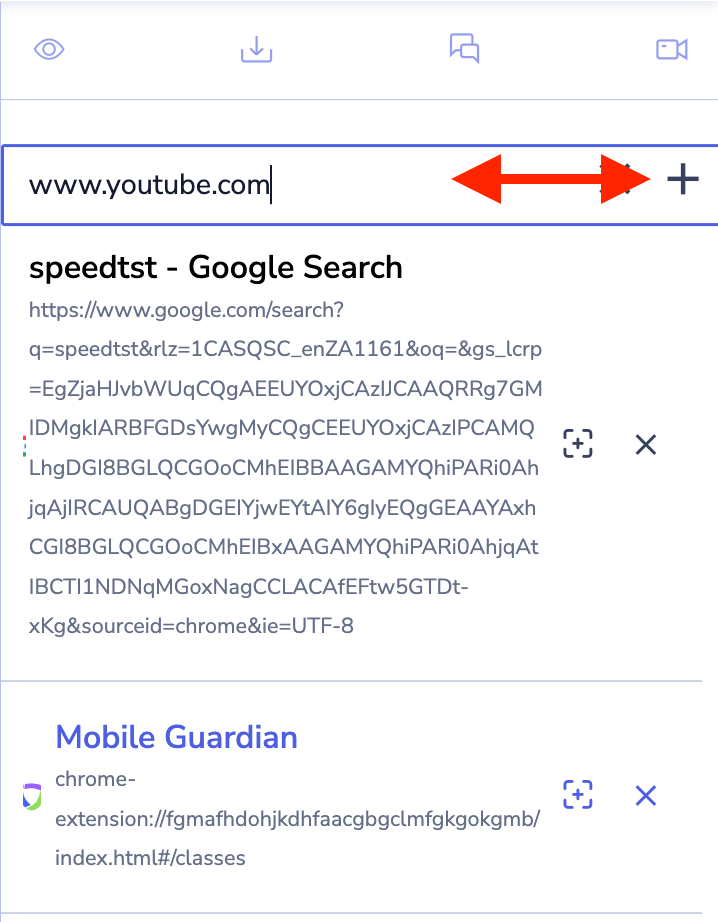 Para añadir una pestaña, simplemente escriba la dirección URL en el Campo de entrada proporcionado y haga clic en el icono (+).