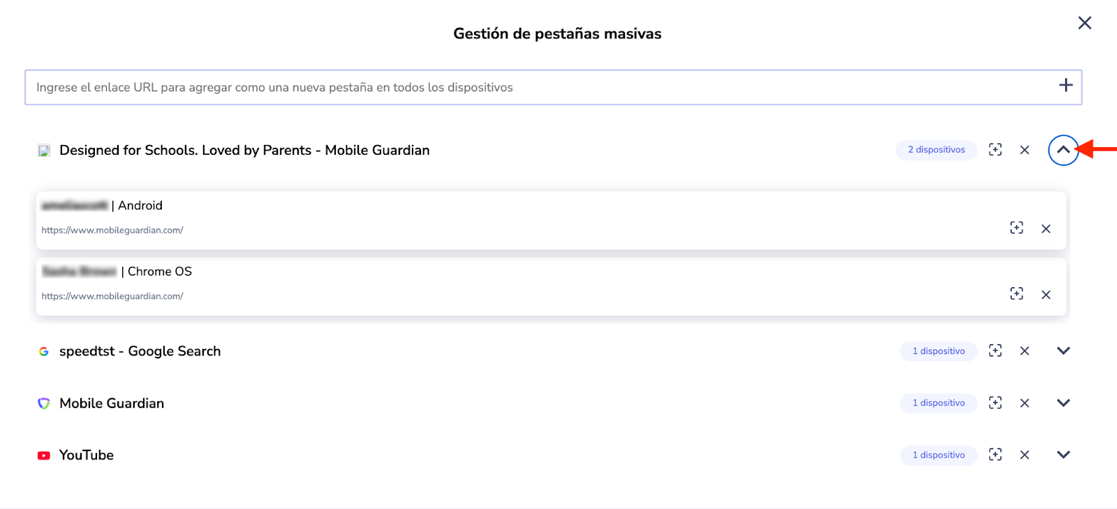 - Para obtener una vista detallada de qué estudiantes o dispositivos se encuentran en una pestaña individual, haga clic en la flecha desplegable situada junto a la URL.