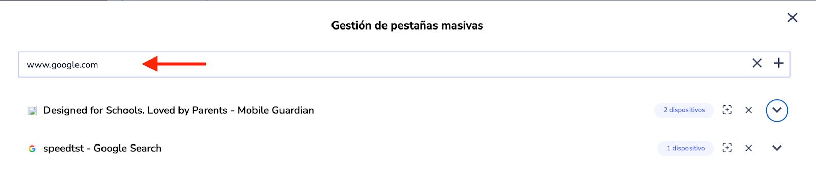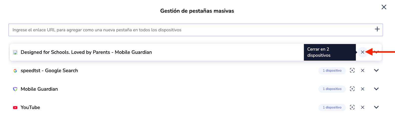 Cuando una clase tiene un gran número de dispositivos o una gran cantidad de pestañas diferentes abiertas durante una sesión, usted podrá cerrar las pestañas de todos los dispositivos Chromebook y Android.