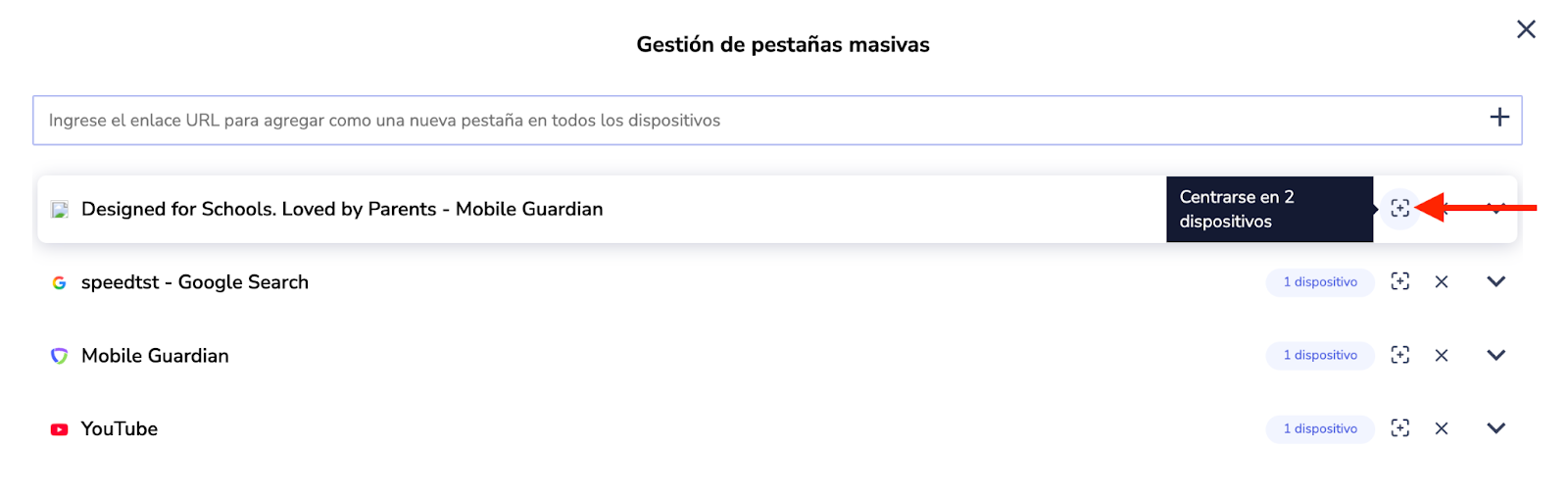 La vista de gestión de pestañas múltiples muestra una lista de todas las pestañas abiertas en todos los dispositivos de su aula. Los siguientes pasos le ayudarán a acceder y gestionar todas las pestañas desde una única interfaz.