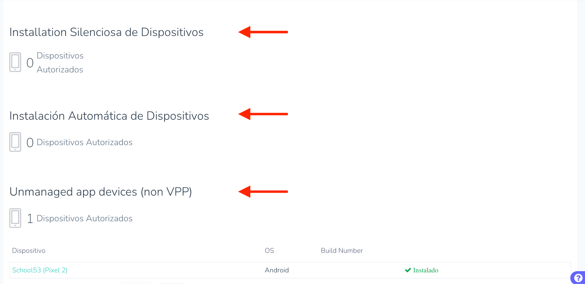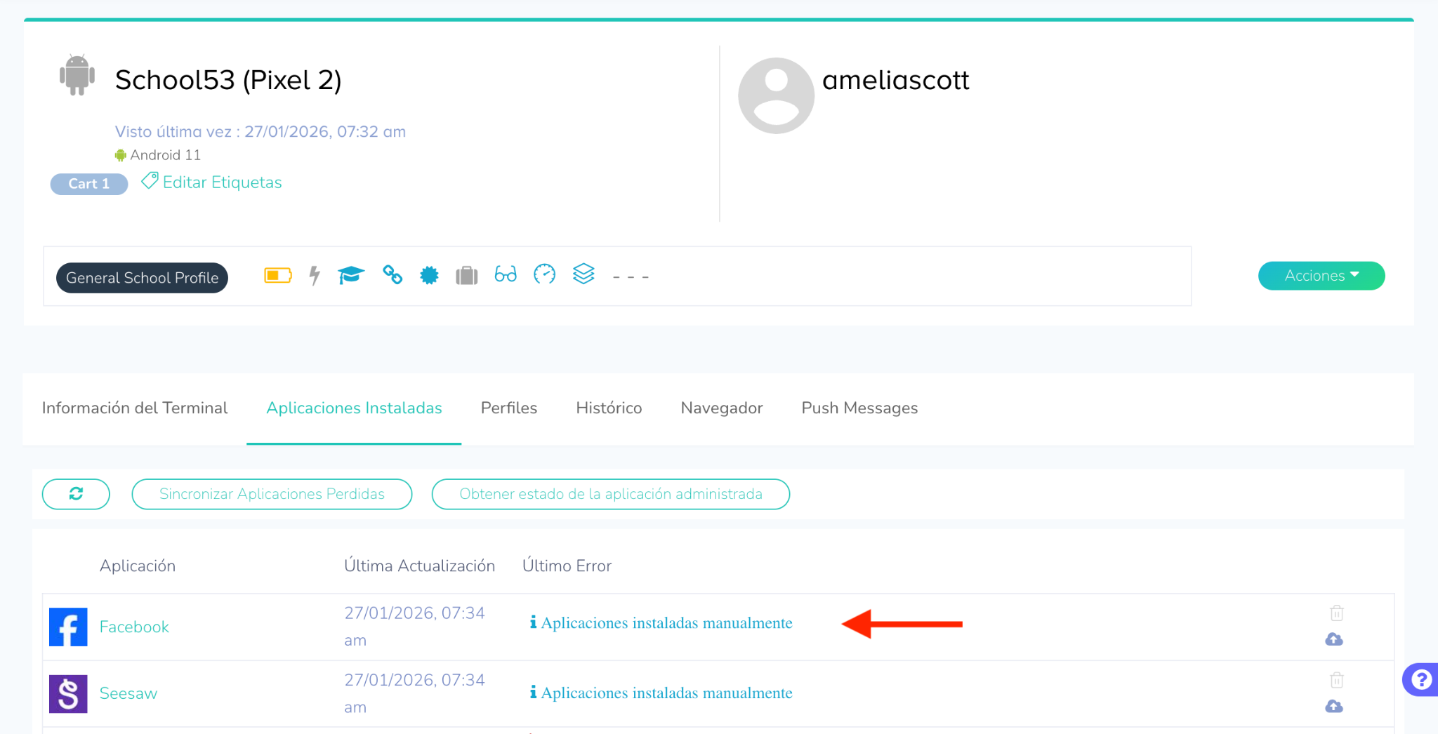 Lista de aplicaciones instaladas en el dispositivo: En la lista de aplicaciones instaladas del dispositivo, verá que la aplicación aparece como “Aplicación instaladas manualmente” si se instaló de esa forma.