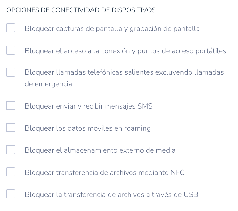 - Bloquear transferencia de archivos mediante NFC: Impide que los usuarios compartan datos a través de la función de transferencia por NFC.