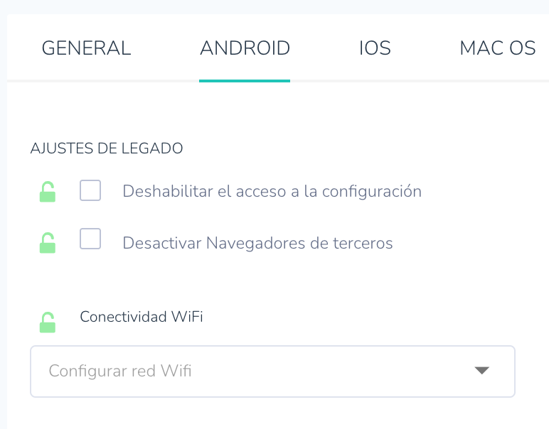 - Seleccione la pestaña "ANDROID" para mostrar todos los ajustes de Android Legacy y Android EMM.