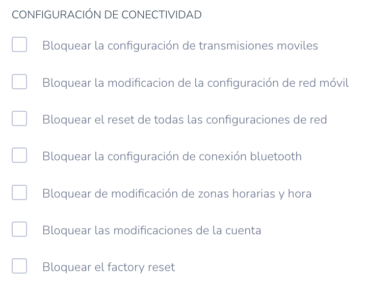 - Bloquear la modificacion de la configuración de red móvil: Evita que los usuarios modifiquen los ajustes de la red móvil.