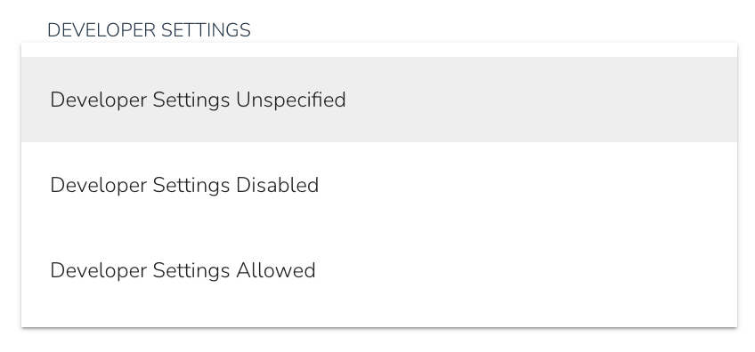 - Developer Settings: Permite a los administradores habilitar o deshabilitar las opciones de desarrollador. Por defecto, están permitidas en el dispositivo.