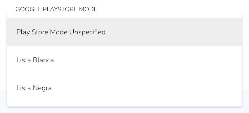 - Playstore Mode Unspecified: Por defecto se establece en Lista Blanca.