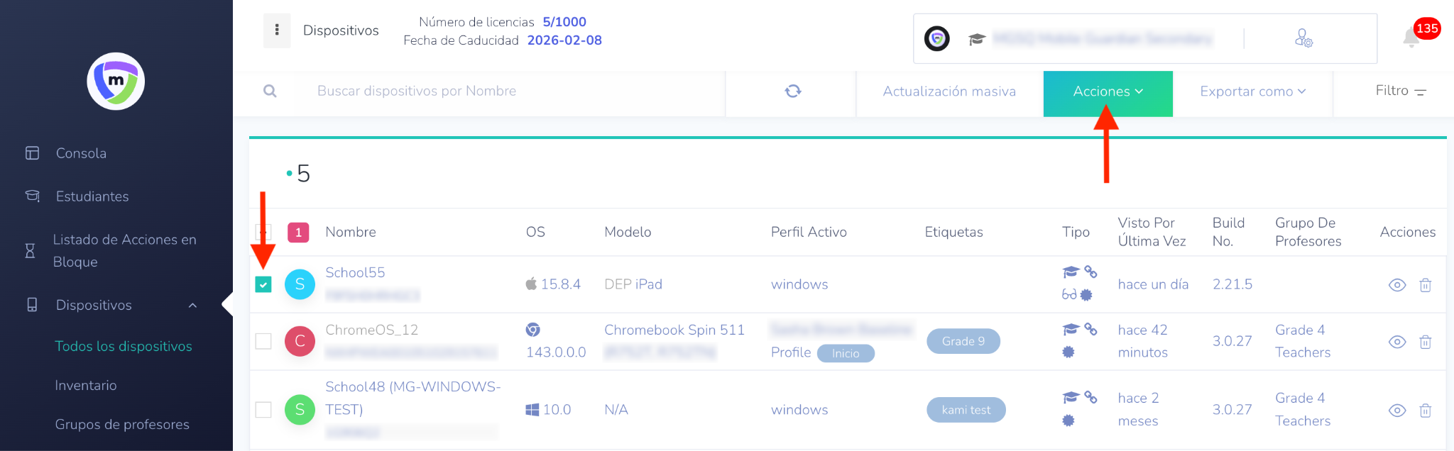 Cada tipo de dispositivo (iOS, Android y Chromebooks) ofrece un conjunto único de acciones masivas adaptadas a su plataforma específica.
