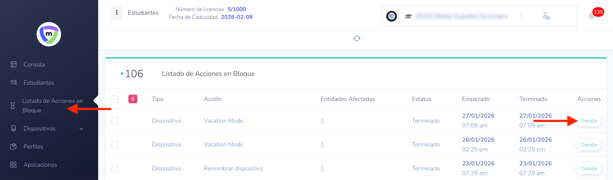 Después de iniciar una acción masiva, puede realizar un seguimiento de su progreso y resultados en la Cola de acciones masivas (Bulk Action Queue). Esta función proporciona información detallada sobre el estado de cada acción, indicando si están en cola, pendientes o completadas. Además, puede ver detalles más específicos para cada dispositivo involucrado.