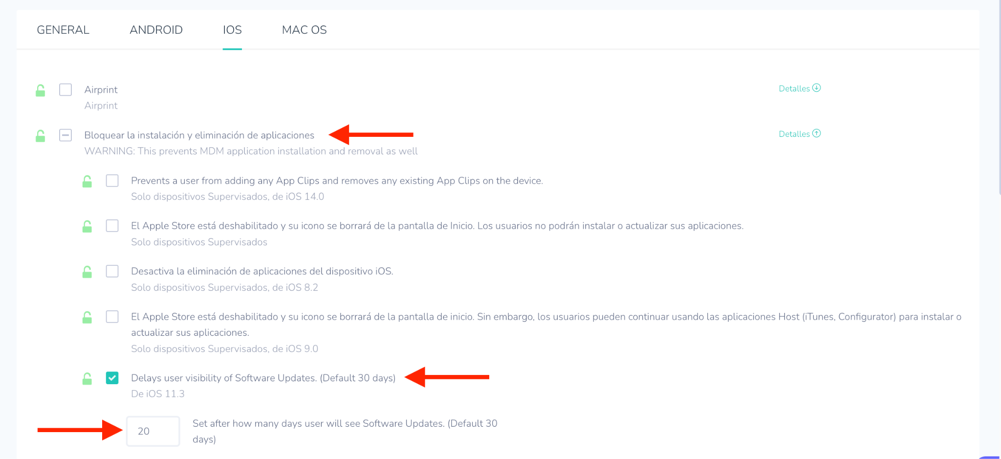 - Establezca "Delays user visibility of Software Updates" (Retrasar la visibilidad de las actualizaciones de software para el usuario) en el periodo de retraso deseado (el valor predeterminado es 30 días).