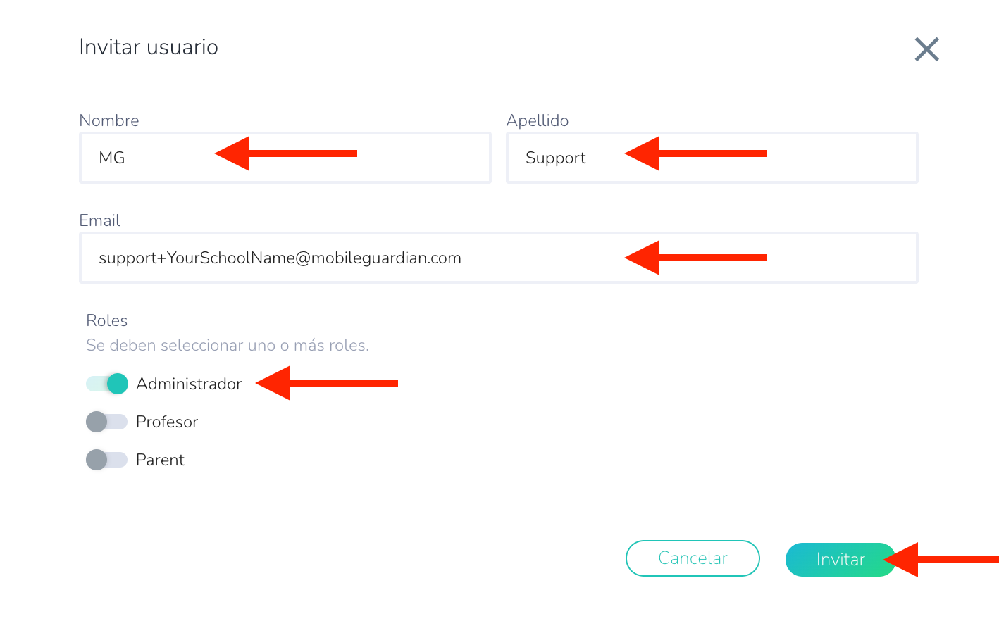 Para configurar un usuario de soporte de Mobile Guardian en su escuela, siga las instrucciones que se detallan a continuación.
