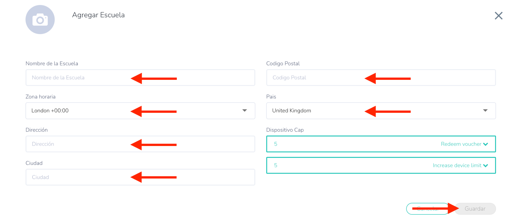 - Ingrese la información requerida para la nueva escuela, incluyendo el nombre de la escuela (School name), la dirección (Address) y el límite de dispositivos (Device cap).