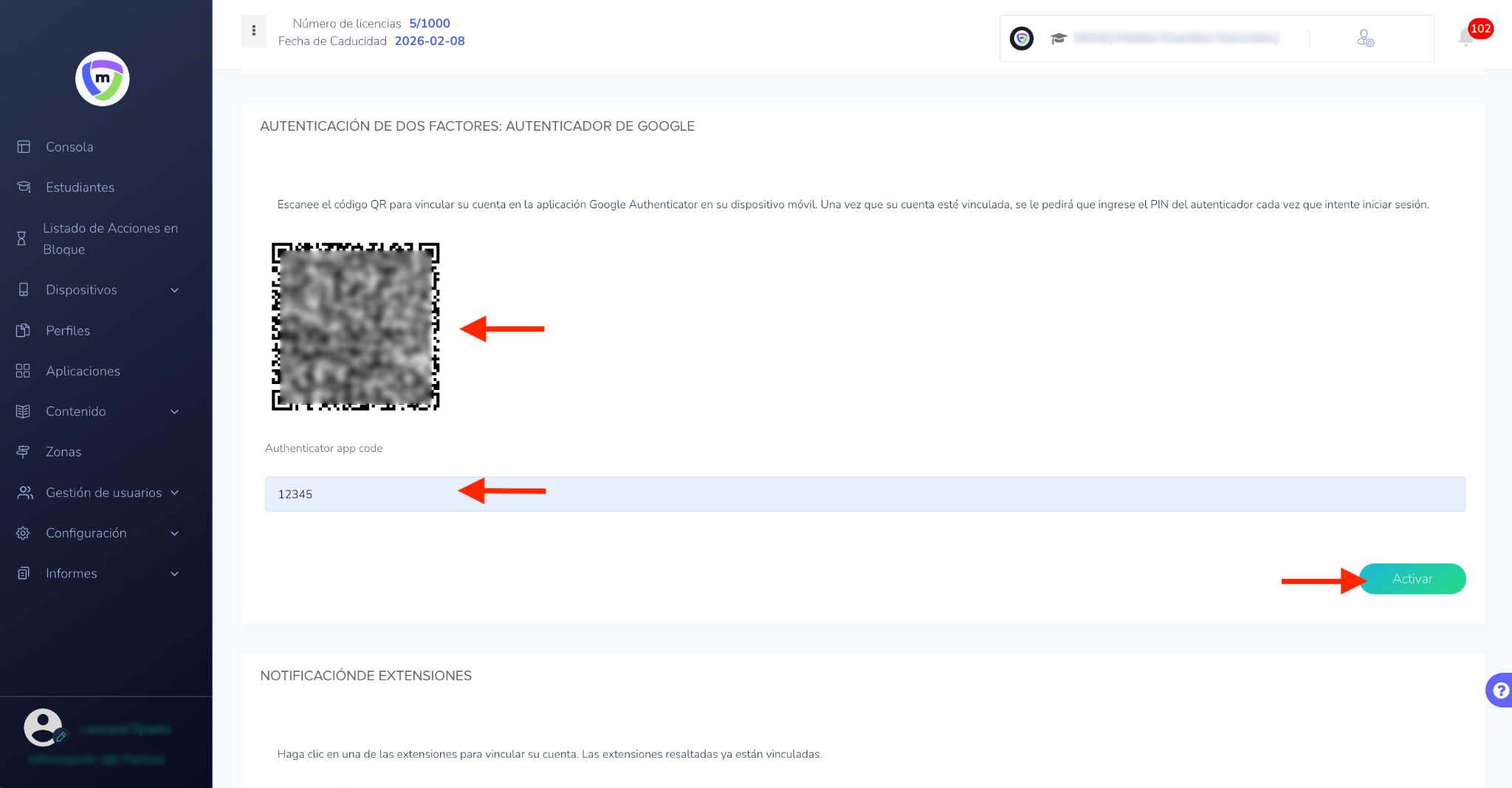 Ingrese el código: Después de escanear el código QR, aparecerá un código de 6 dígitos en la aplicación Google Authenticator. Ingrese este código en el campo correspondiente del Panel de Control de Mobile Guardian y haga clic en “Activate”.