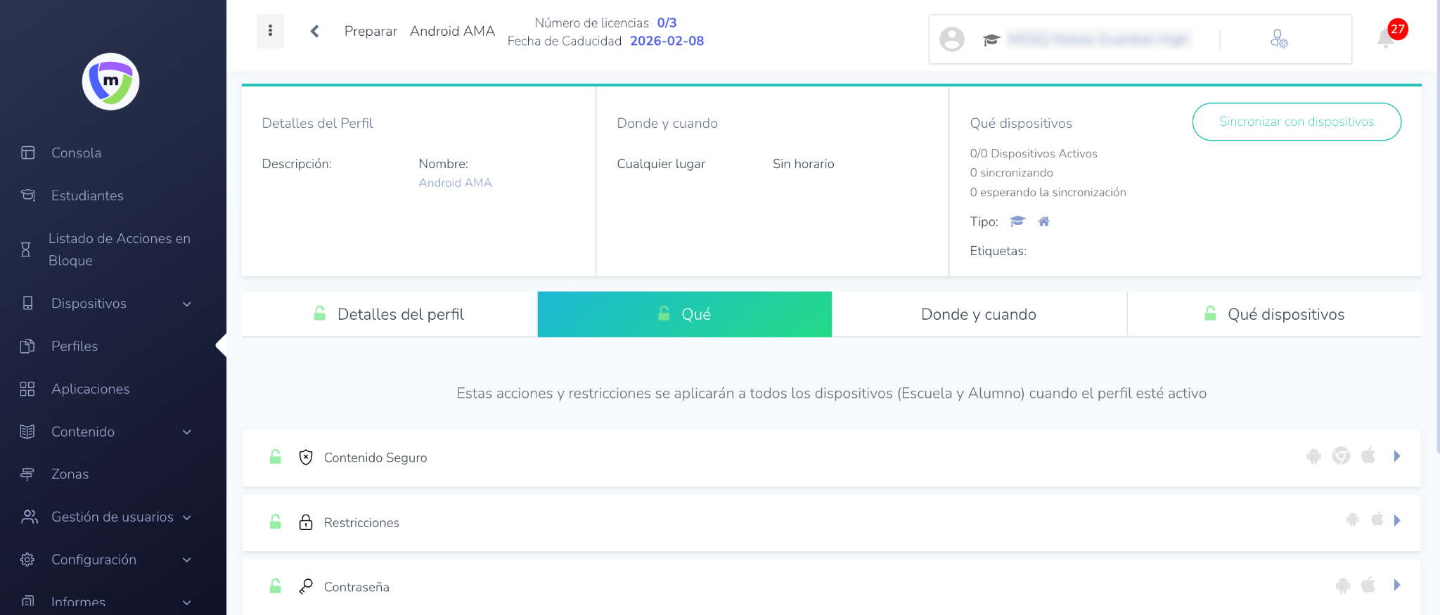 - Una vez que haya configurado el modo de Google Playstore y añadido sus aplicaciones, asegúrese de que los perfiles estén sincronizados con los dispositivos. Esta acción envía las actualizaciones de las políticas a los dispositivos gestionados.