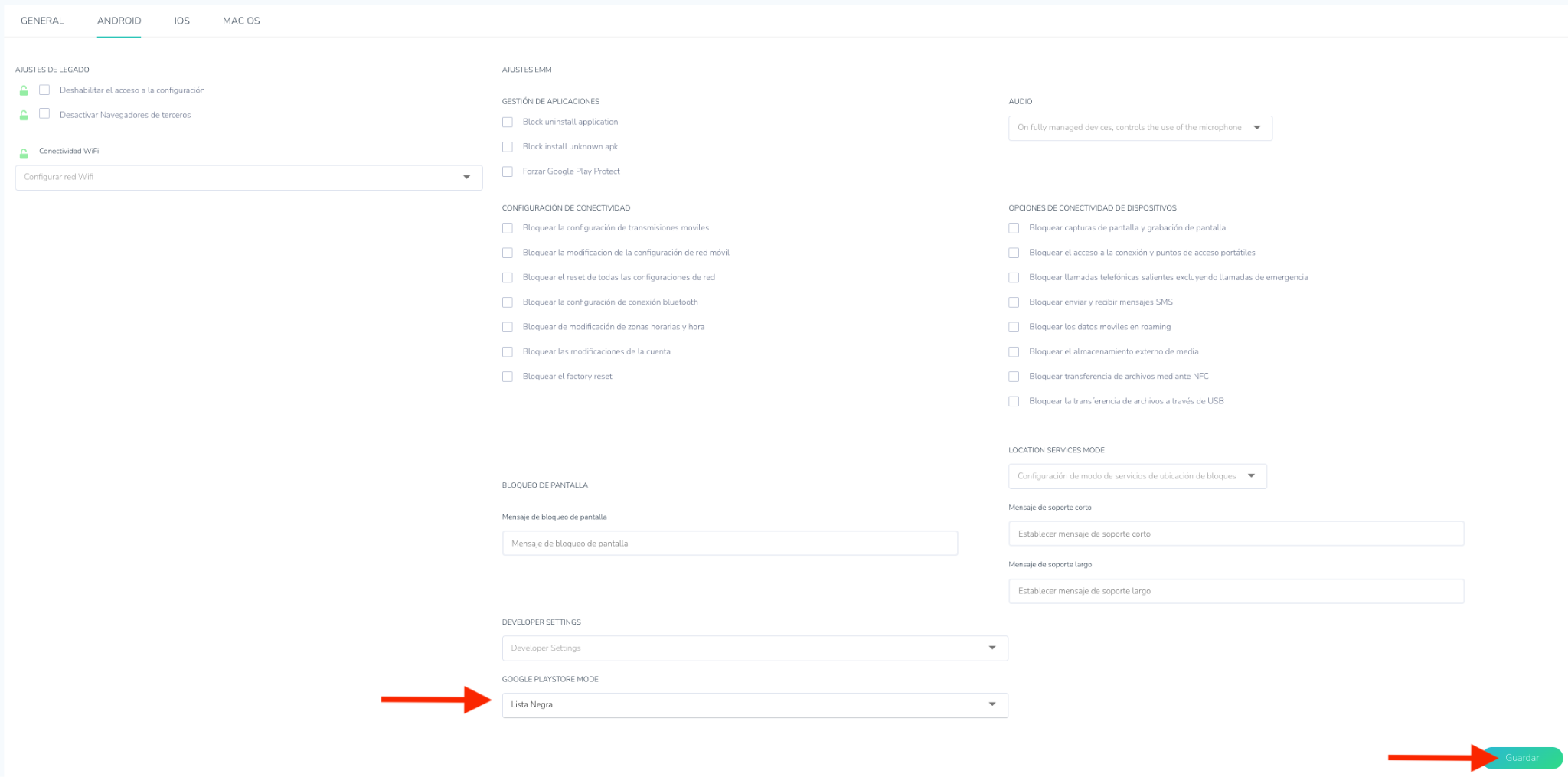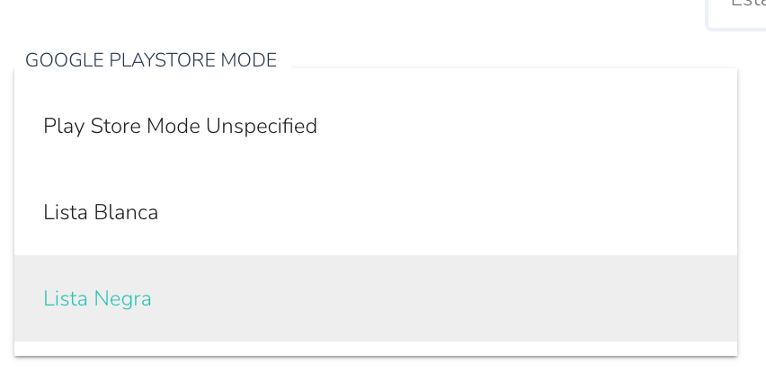- Lista blanca: Solo las aplicaciones enumeradas en la política estarán disponibles; todas las demás se desinstalarán.