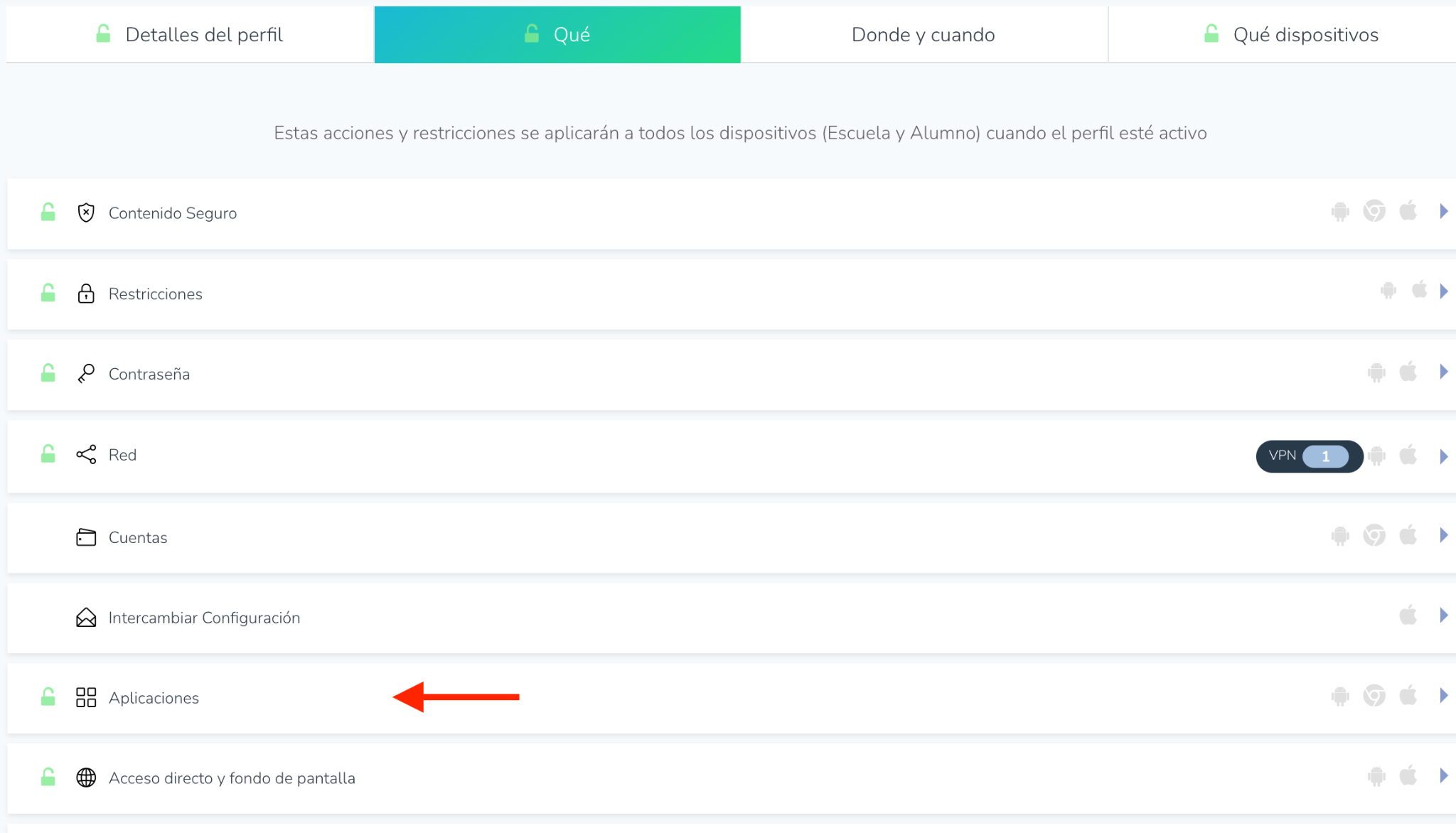 - Navegue a la configuración de perfil de los dispositivos que desea gestionar.