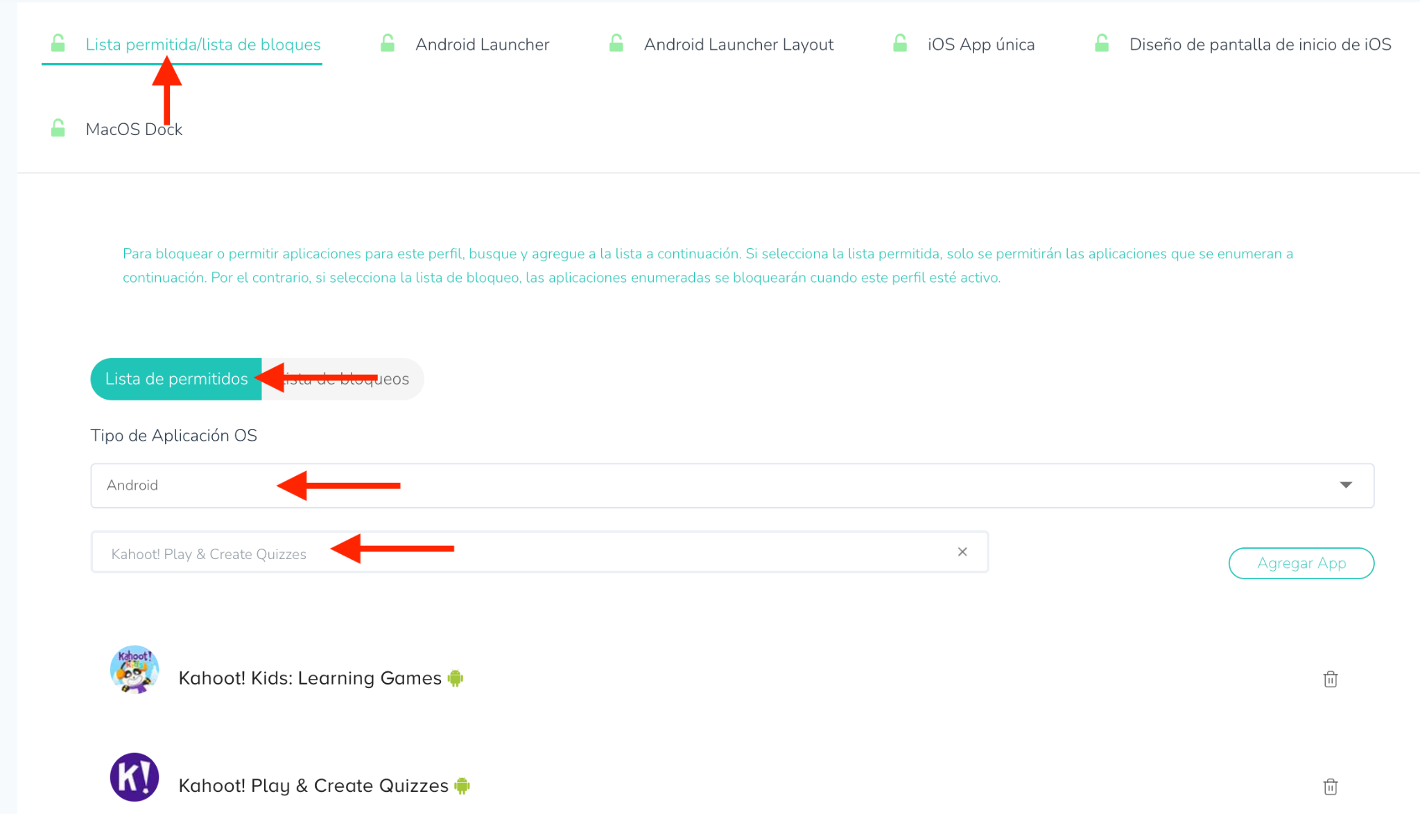 - Lista Negra: Todas las aplicaciones están disponibles y solo las aplicaciones bloqueadas explícitamente estarán restringidas.