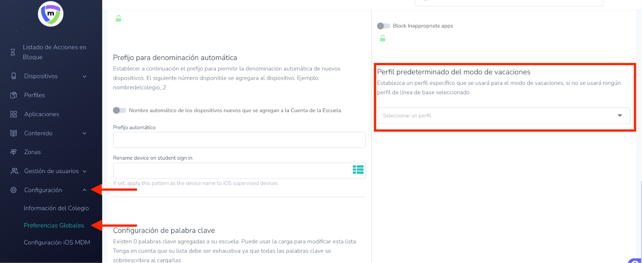 El modo vacaciones permite que su escuela aplique un perfil menos restrictivo durante los días festivos o periodos vacacionales. Configurar un perfil de vacaciones predefinido le permite gestionar fácilmente el cambio de los dispositivos a dicho perfil.