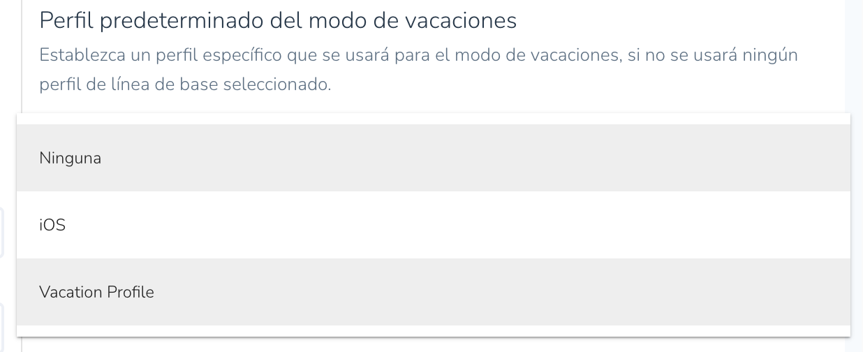 - Elija el perfil que desea establecer como predeterminado para el modo Vacaciones en el menú desplegable.