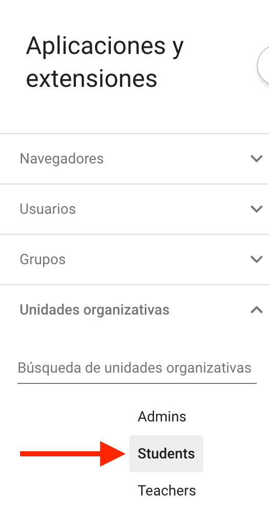 Verá su estructura organizativa en la parte izquierda de la pantalla. Seleccione la Unidad Organizativa (OU) específica donde desea desplegar la nueva extensión personalizada. Esto garantiza que la actualización se aplique únicamente a los dispositivos de los estudiantes correspondientes.