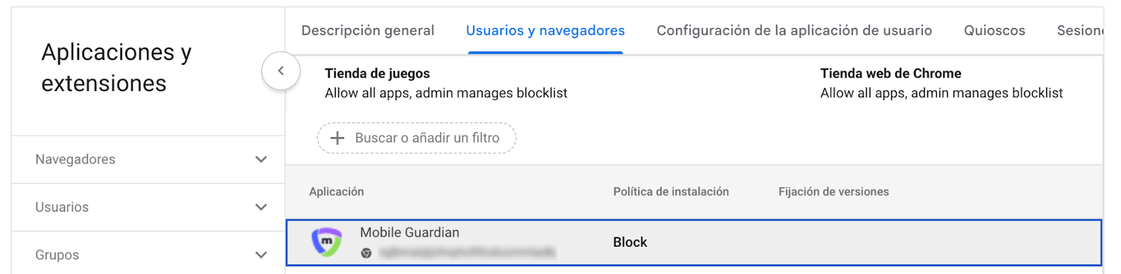 Una vez seleccionada y guardada la configuración, asegúrese de que la política de instalación (Installation Policy) haya cambiado a BLOCK (BLOQUEAR) en la extensión de Mobile Guardian.