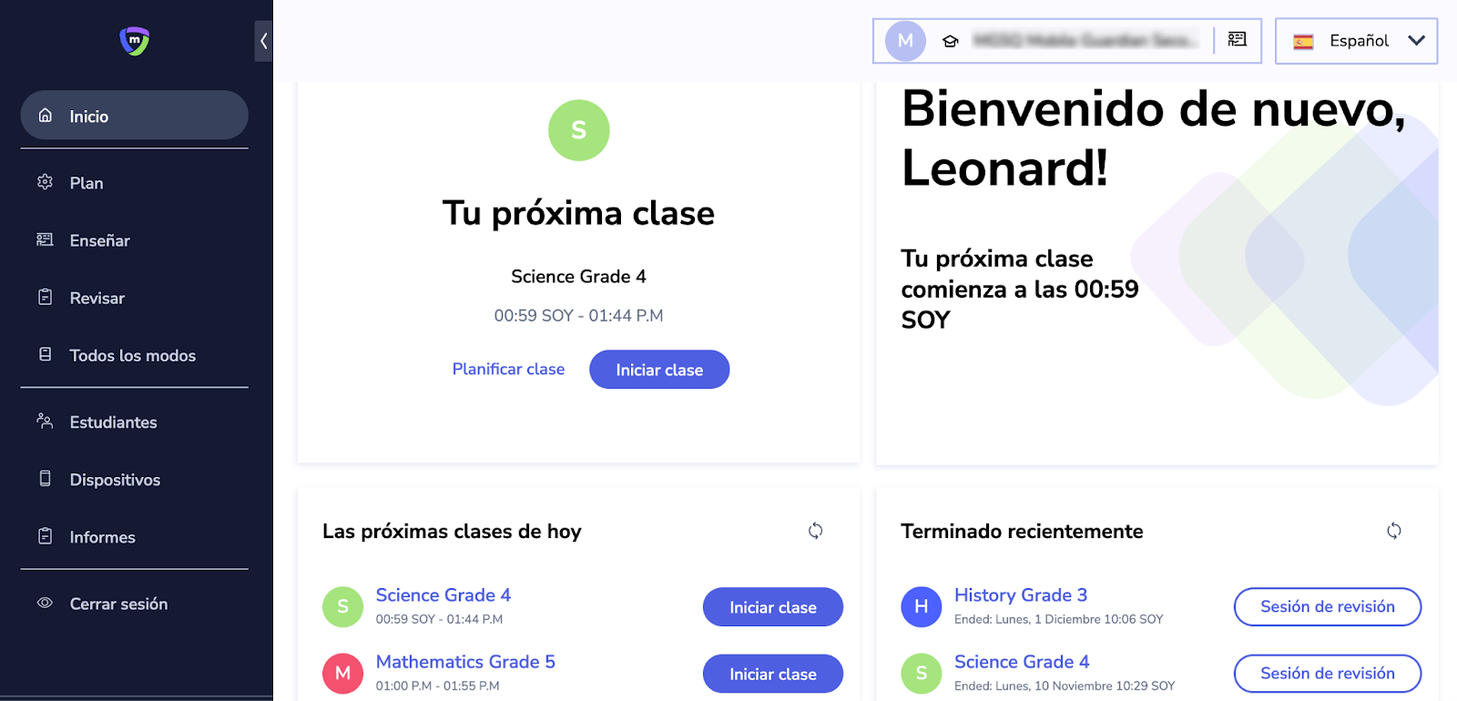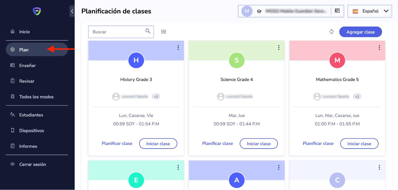 - Tu próxima clase: Puede ver su próxima clase programada; además, también podrá planificar e iniciar la clase.