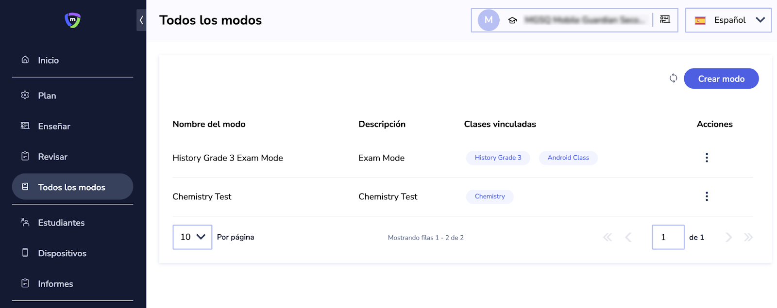 Un "Modo" es una función que le permite a usted, como profesor, restringir el contenido y las actividades de su clase según su elección durante una clase activa. En esta sección, tiene la posibilidad de añadir un nuevo modo que se crea dentro de la clase seleccionada. También tiene la posibilidad de verlos.