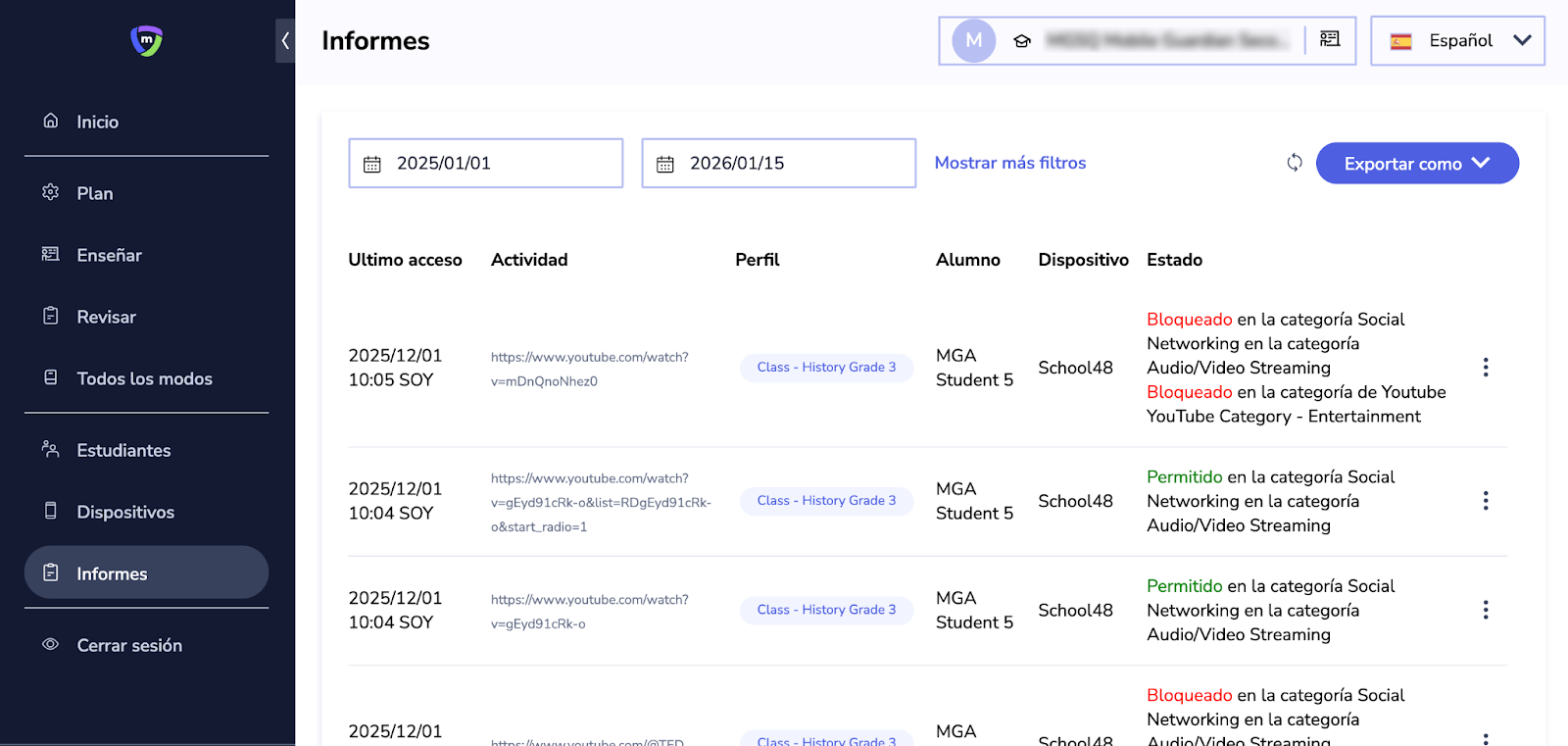 El informe de filtrado web para profesores permitirá a los docentes obtener un reporte del historial de navegación de cada estudiante que asista a cualquiera de sus clases. El informe contendrá una lista de los sitios web que el estudiante visitó durante el transcurso de la clase.