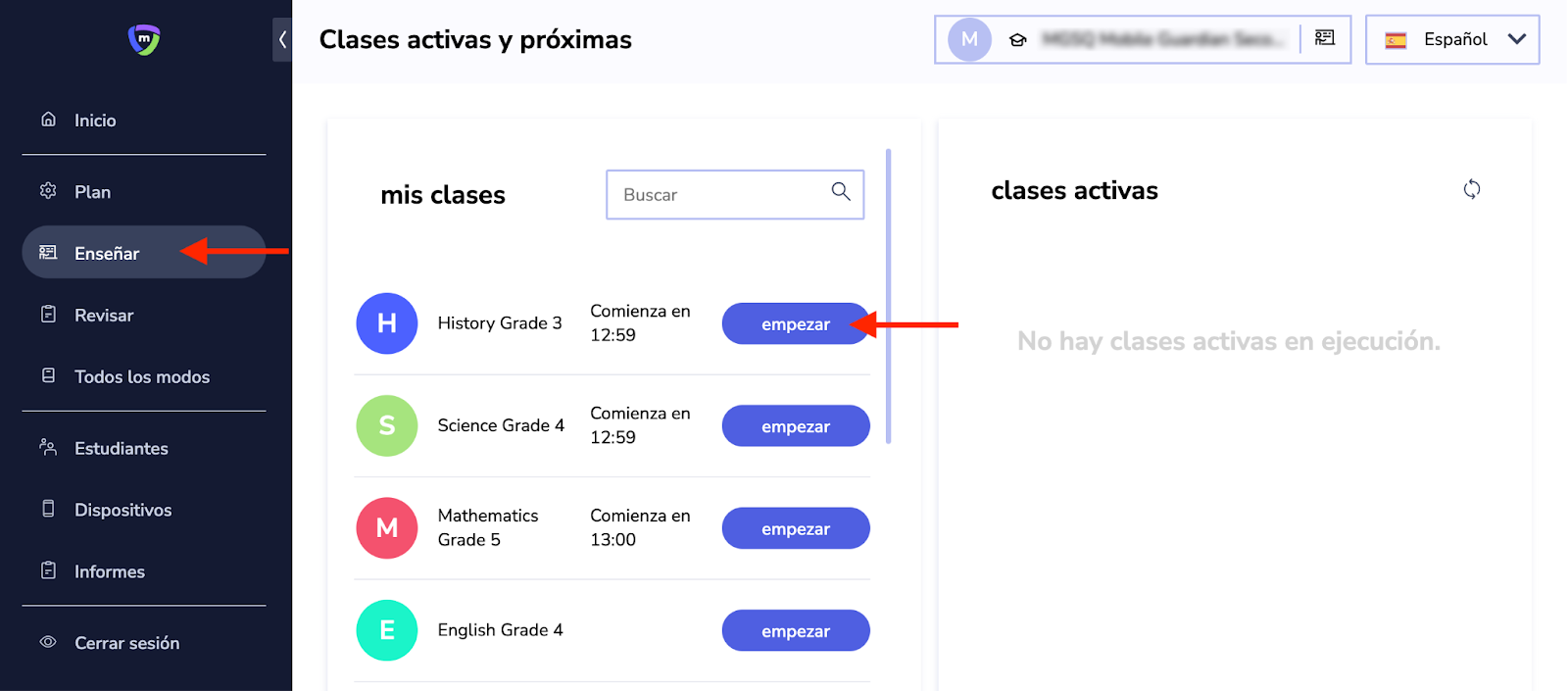 En la pestaña, puede ver sus clases activas y programadas. Esta sección también le permite iniciar una clase.