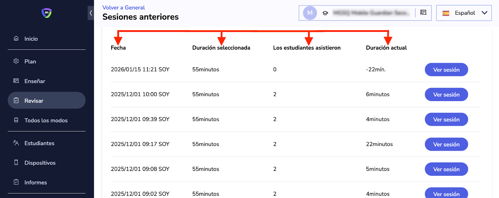 Esta sección le permite ver sus sesiones anteriores. Puede consultar la fecha en que se impartió la clase, la duración seleccionada, el número de estudiantes que asistieron y la duración real. También puede hacer clic en "Ver sesión" para ver configuraciones adicionales de la sesión.
