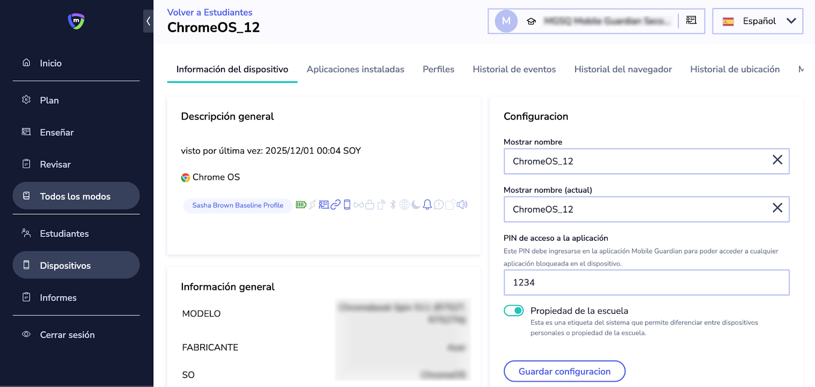 - Ver la configuración actual del dispositivo: por ejemplo, si el dispositivo está supervisado, el estado de propiedad, si las notificaciones de alerta están habilitadas o no, información del sistema operativo, etc.