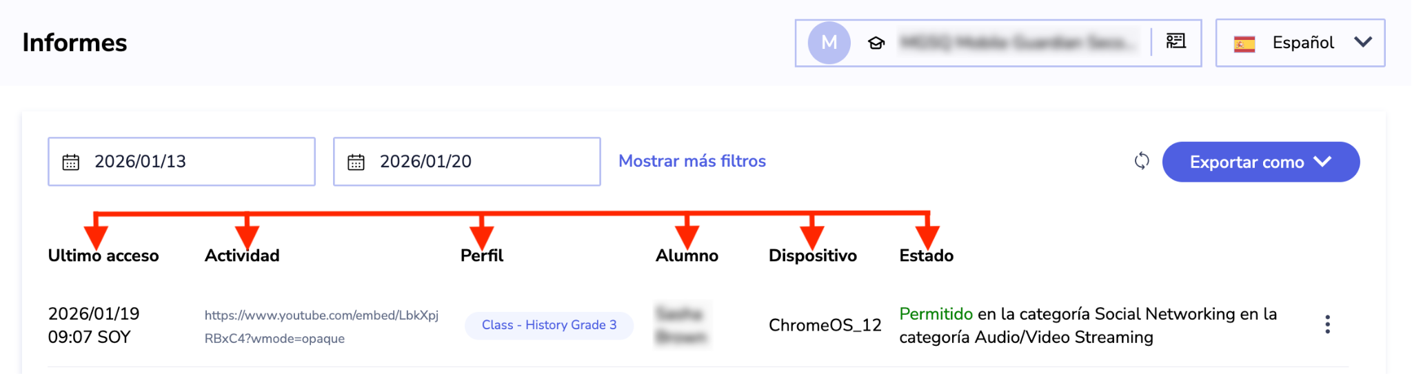 El informe le proporcionará una lista de los sitios web a los que accedieron los estudiantes.