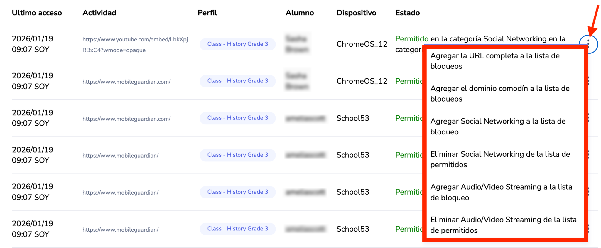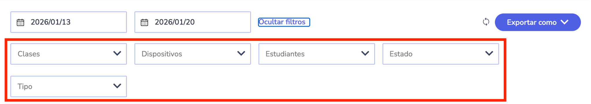 - Clases: Puede filtrar el historial de filtrado web por clase para ver lo que se consultó únicamente durante una clase específica.