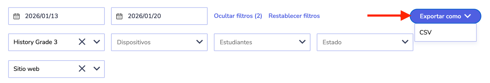 Si desea exportar su informe filtrado, haga clic en "Exportar como" en la esquina superior derecha de la ventana y luego seleccione CSV. El documento se descargará automáticamente en su carpeta de descargas.