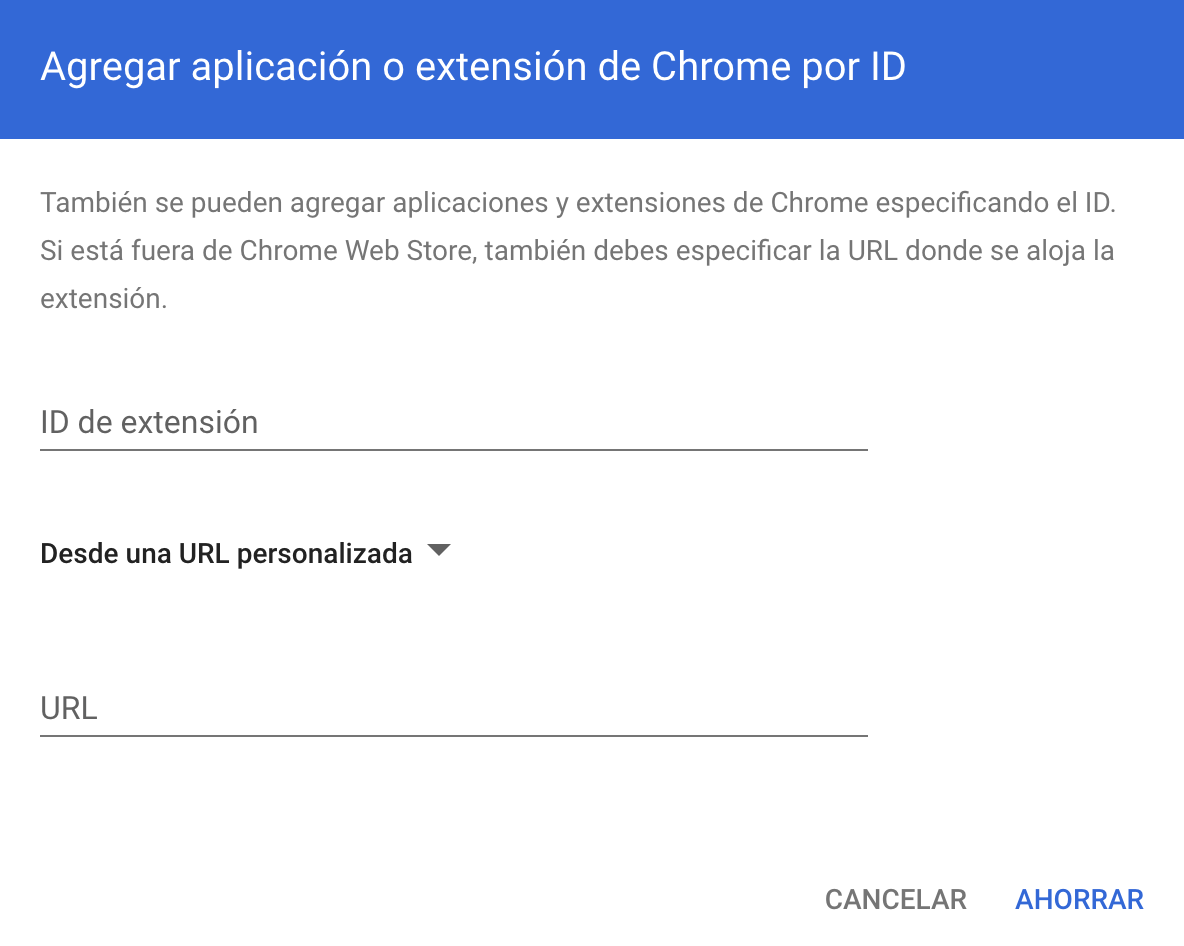 - URL personalizada (Custom URL): Después de añadir el ID de la extensión, seleccione el menú desplegable de "From a custom URL" (Desde una URL personalizada) y, a continuación, introduzca la URL personalizada (que también encontrará en su panel de Mobile Guardian) en el campo correspondiente.