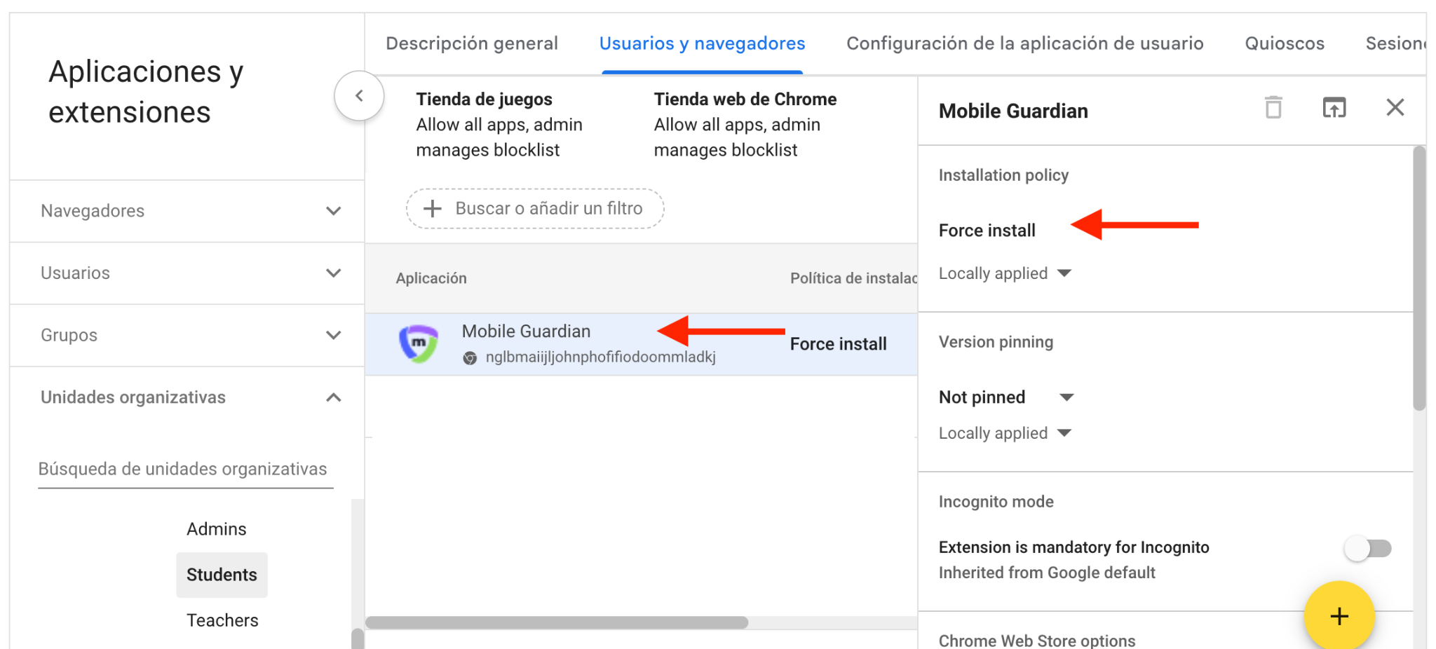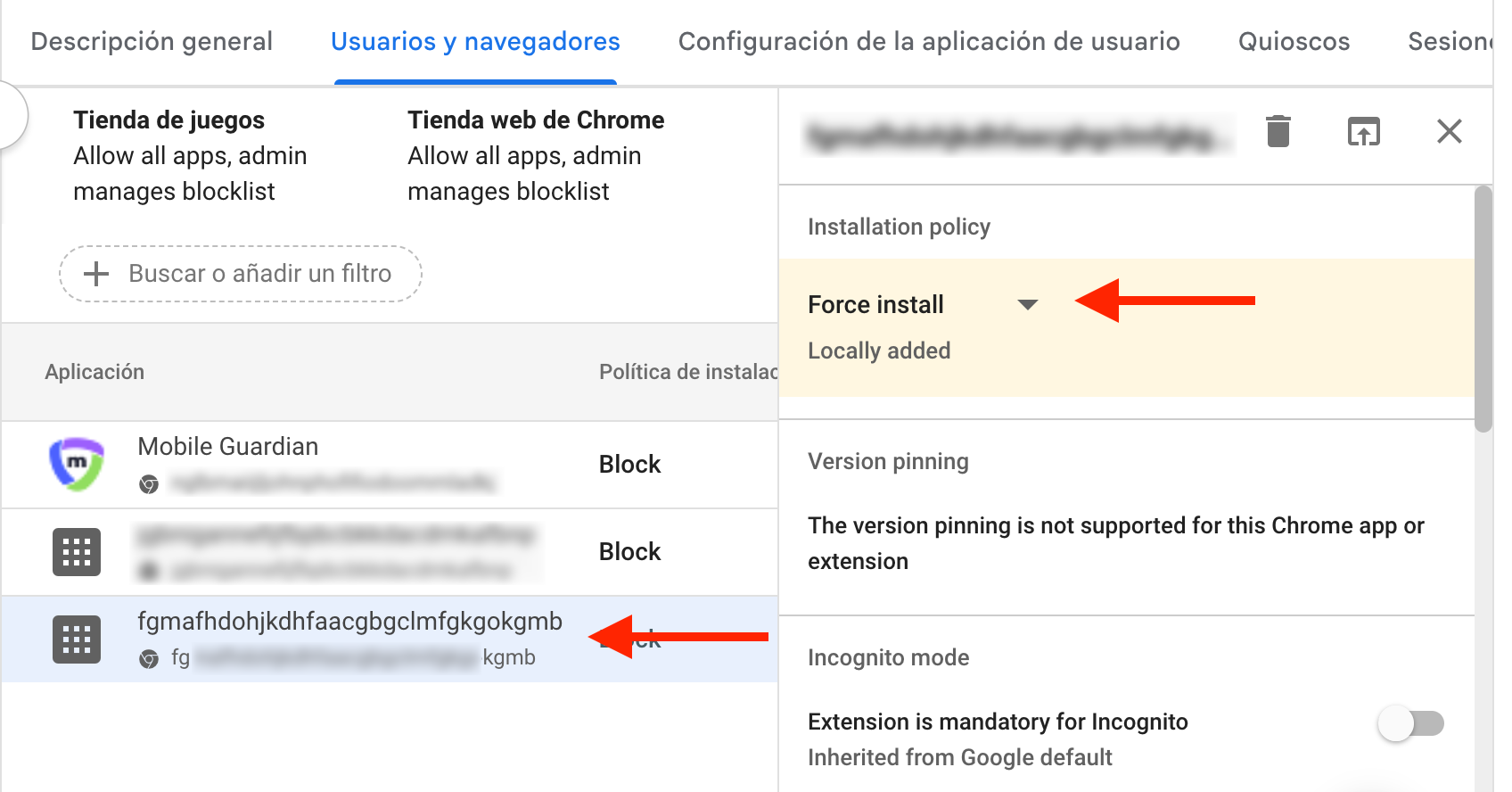 Localice la nueva extensión en la lista. En la columna "Installation policy" (Política de instalación) de esta extensión, haga clic en el menú desplegable y cambie la configuración a "Force install" (Instalación forzada). Esto garantiza que la extensión se despliegue automáticamente en todos los dispositivos dentro de esa unidad organizativa.