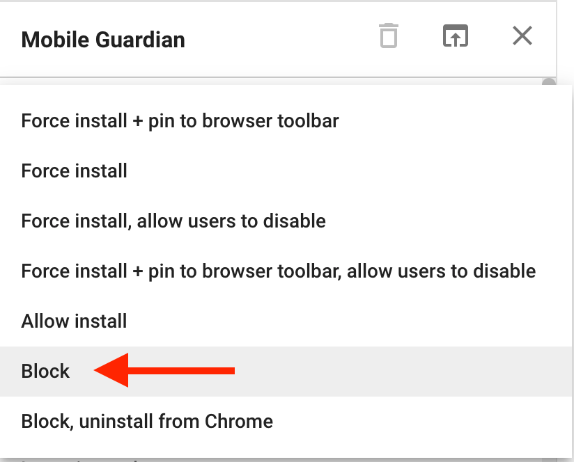 Una vez seleccionada y guardada la configuración, asegúrese de que la política de instalación (Installation Policy) haya cambiado a BLOCK (BLOQUEAR) en la extensión de Mobile Guardian.