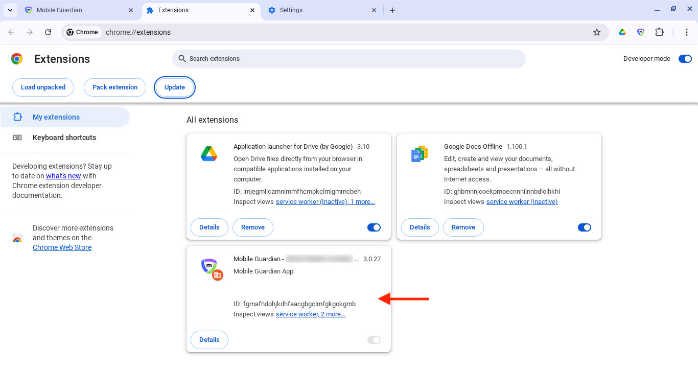 - Compruebe si la nueva extensión de Mobile Guardian compatible con Manifest V3 aparece en la lista y está habilitada.