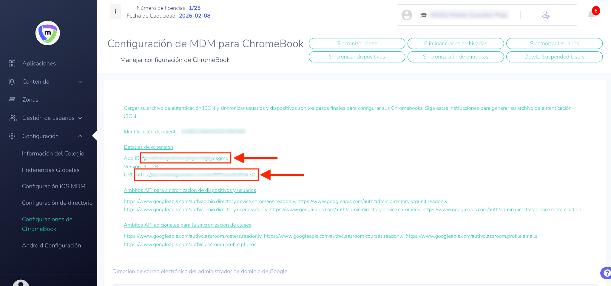 - Extension ID (ID de la extensión): Encontrará este dato en la pestaña de configuración de Chrome (Chrome settings) dentro de su panel de Mobile Guardian. Introdúzcalo en el campo "Extension ID".