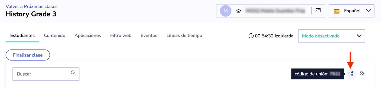 Ha llegado el momento de impartir su clase. Cada clase genera un código al iniciarse para que los estudiantes opten por unirse a ella. Puede enviar el código a los alumnos para su uso o escribirlo en la pizarra al comienzo de la lección.