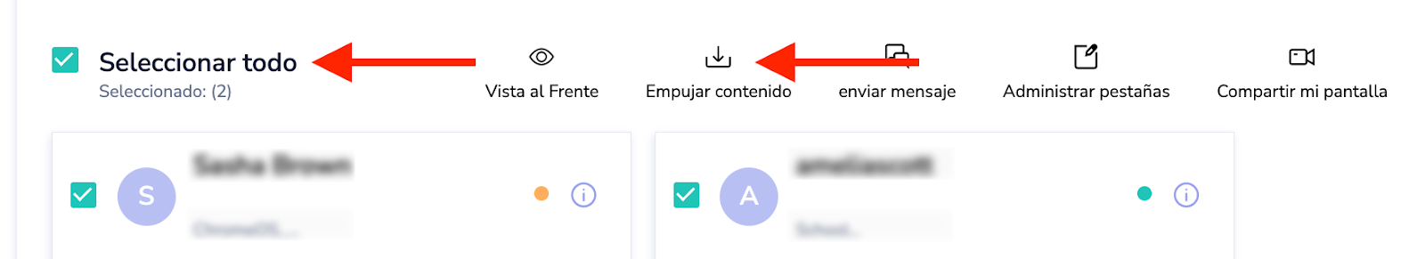 - La primera opción consiste en seleccionar a todos los estudiantes o a estudiantes específicos y utilizar el botón de acción Enviar contenido. De este modo, podrá enviar el contenido predefinido a los alumnos.
