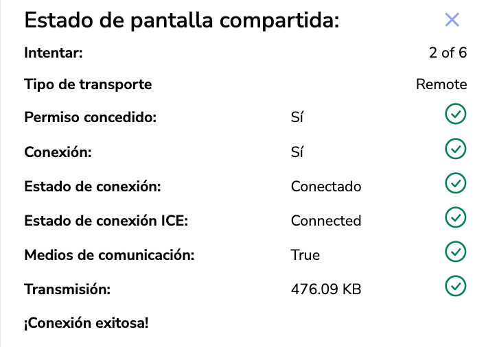 Al seleccionar el icono de estado de uso compartido de pantalla, aparecerá una tabla con información sobre dónde ha tenido éxito o fallado la conexión, junto con los intentos de conexión, la velocidad de transmisión y el tipo de conexión de transmisión.