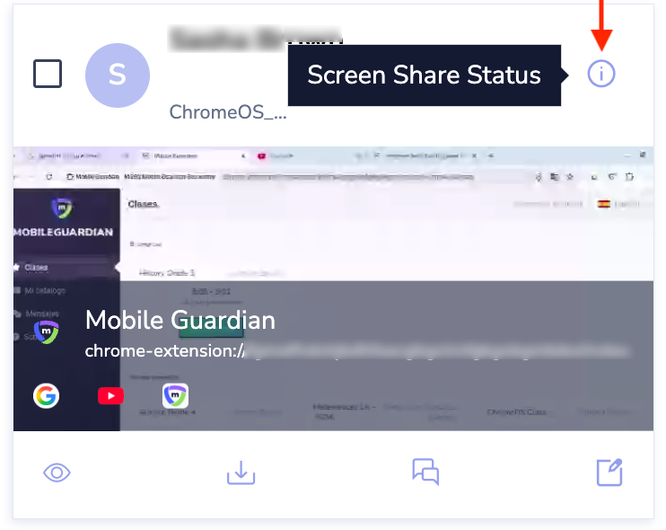 Cuando una clase está activa en la plataforma Mobile Guardian, los profesores pueden seleccionar el icono de Estado del uso compartido de pantalla para acceder a la "Tabla de estado del uso compartido de pantalla". Esta tabla está diseñada para mostrar el estado de conexión del dispositivo con la clase en tiempo real, con el fin de proporcionar a los profesores una visión general más intuitiva y práctica de los estados de conexión de los dispositivos.