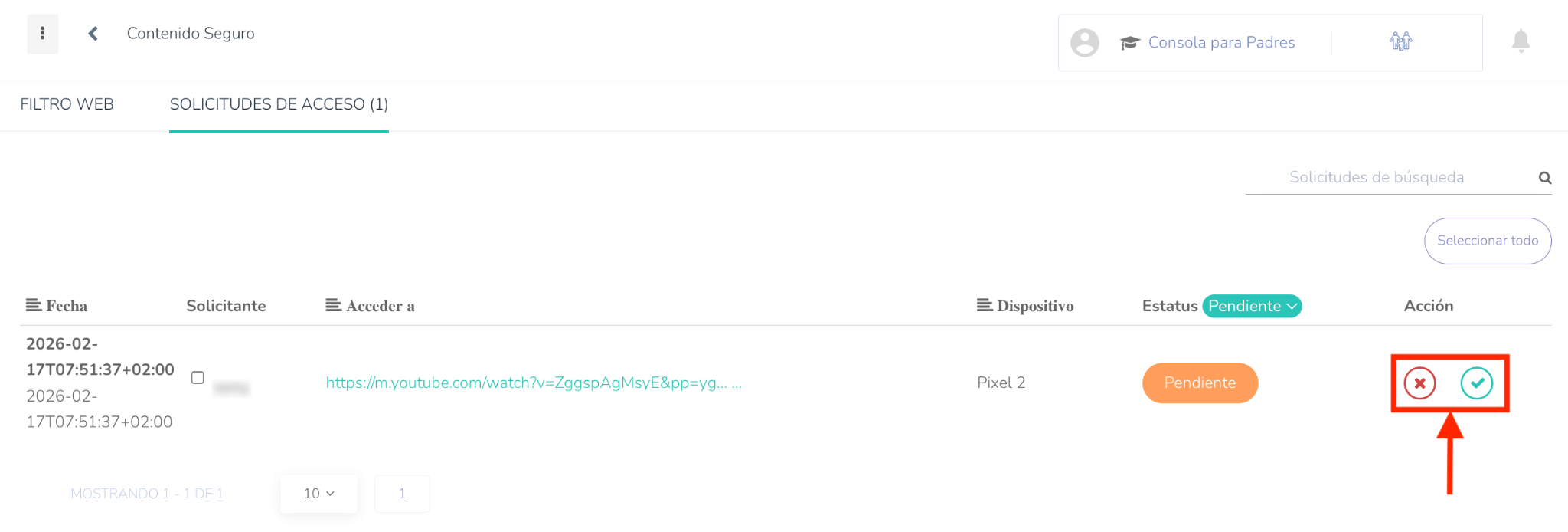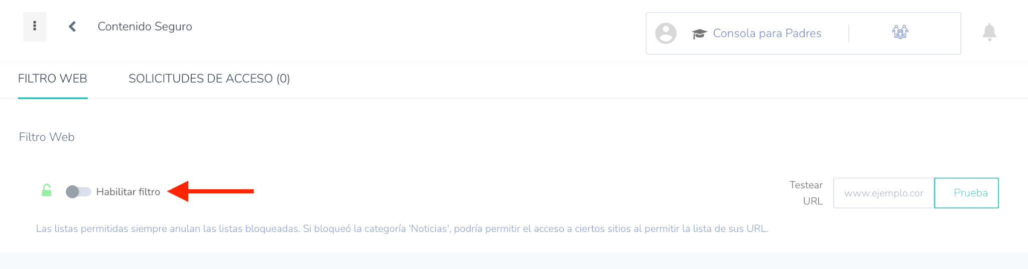 Dentro de los ajustes de Contenido Seguro, podrá acceder a las Solicitudes de acceso de su hijo en caso de que se le haya bloqueado un sitio web específico y necesite que usted le conceda acceso.